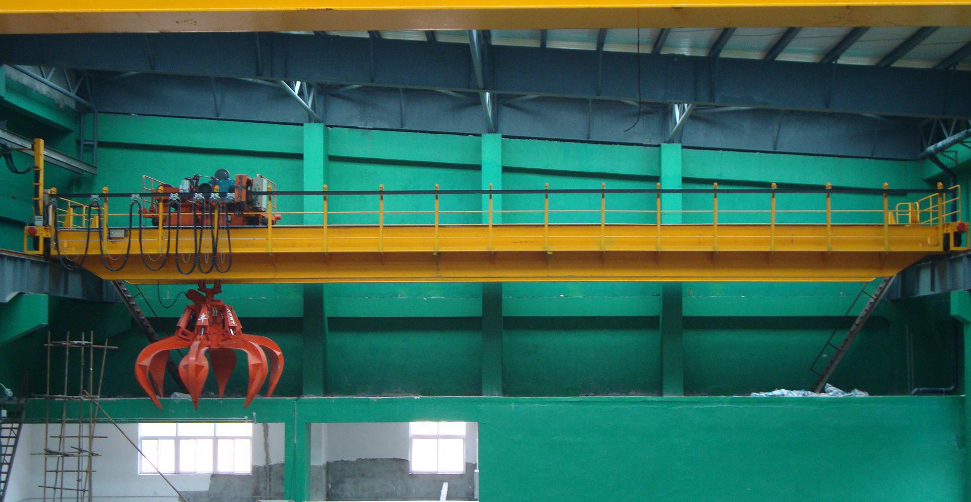 抓斗桥式起重机的结构与吊钩桥式起重机基本相同,只是起升机构和吊具有所不同。抓斗桥式起重机的吊具为抓斗,以四根钢丝绳分别悬挂在开闭机构和起升机构上。主要用于散货、废旧钢铁、木材等的装卸、吊运作业。