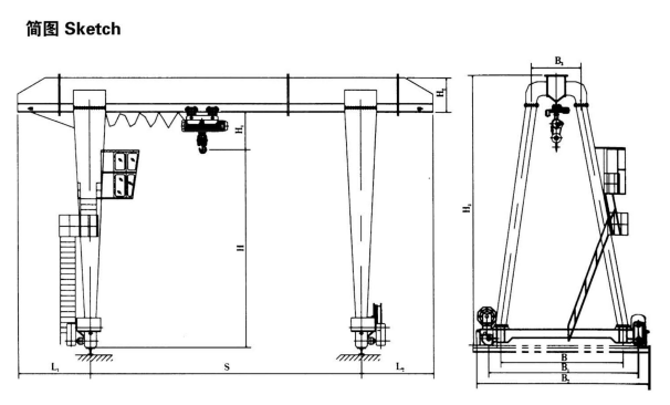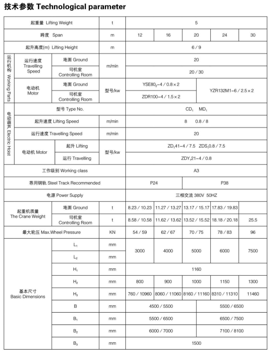 MH型5t单梁门式起重机是中小型可带悬臂的简易5t门式起重机,5t电动葫芦采用CDI、MDI等形式,主梁是U型槽板与工字钢焊接而成的组合梁,大车运行机构采用三合一驱动装置。其适用起重量为5t,适用跨度为7.5-30米,工作环境温度在-25—+40℃范围内。其结构简单、安装、使用、维修方便,多用于工厂、货场、码头、水电站等使用频度低或额定起重量起吊次数少的场所。