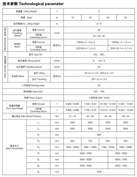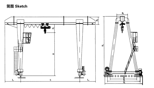 MH型3t单梁门式起重机是中小型可带悬臂的简易3t门式起重机,3t电动葫芦采用CDI、MDI等形式,主梁是U型槽板与工字钢焊接而成的组合梁,大车运行机构采用三合一驱动装置。其适用起重量为3t,适用跨度为7.5-30米,工作环境温度在-25—+40℃范围内。其结构简单、安装、使用、维修方便,多用于工厂、货场、码头、水电站等使用频度低或额定起重量起吊次数少的场所。
