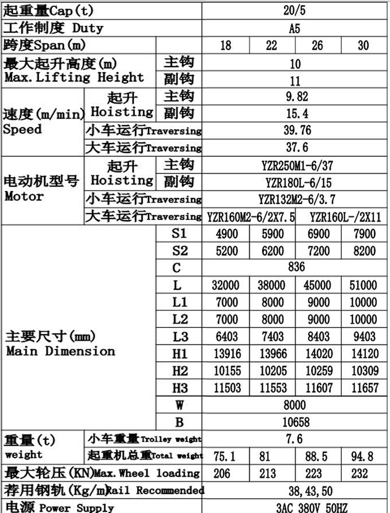 MG型通用20t(5t)门式起重机属双主梁通用门式起重机,也称A型20t/5t双梁门吊,主起升主钩起重量20t,副钩副起升起重量5t,由桥架、大车运行机构、小车、电气设备等部分构成。本20t/是按照GB/T14406-1993《通用门式起重机》设计制造,起重量20t5t,工作环境为-20~+40℃,工作级别A5、A6两种。