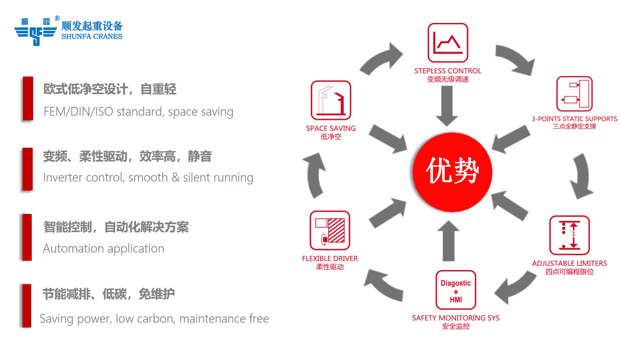 欧式双梁桥式起重机是基于欧洲轻量化和模块化设计理念以及先进生产制造工艺,在桥架上设置一台小车及起升机构,小车可以前后运行,大车运行等机构,实现物料物体在立体空间搬运,使整个起重机的结构紧凑,运行平稳,自重减轻,高度降低,节能减耗,大大减少用户对起重机运行厂房的建造成本和起重机运行费用,提高起重机的整机品质和运行性能。