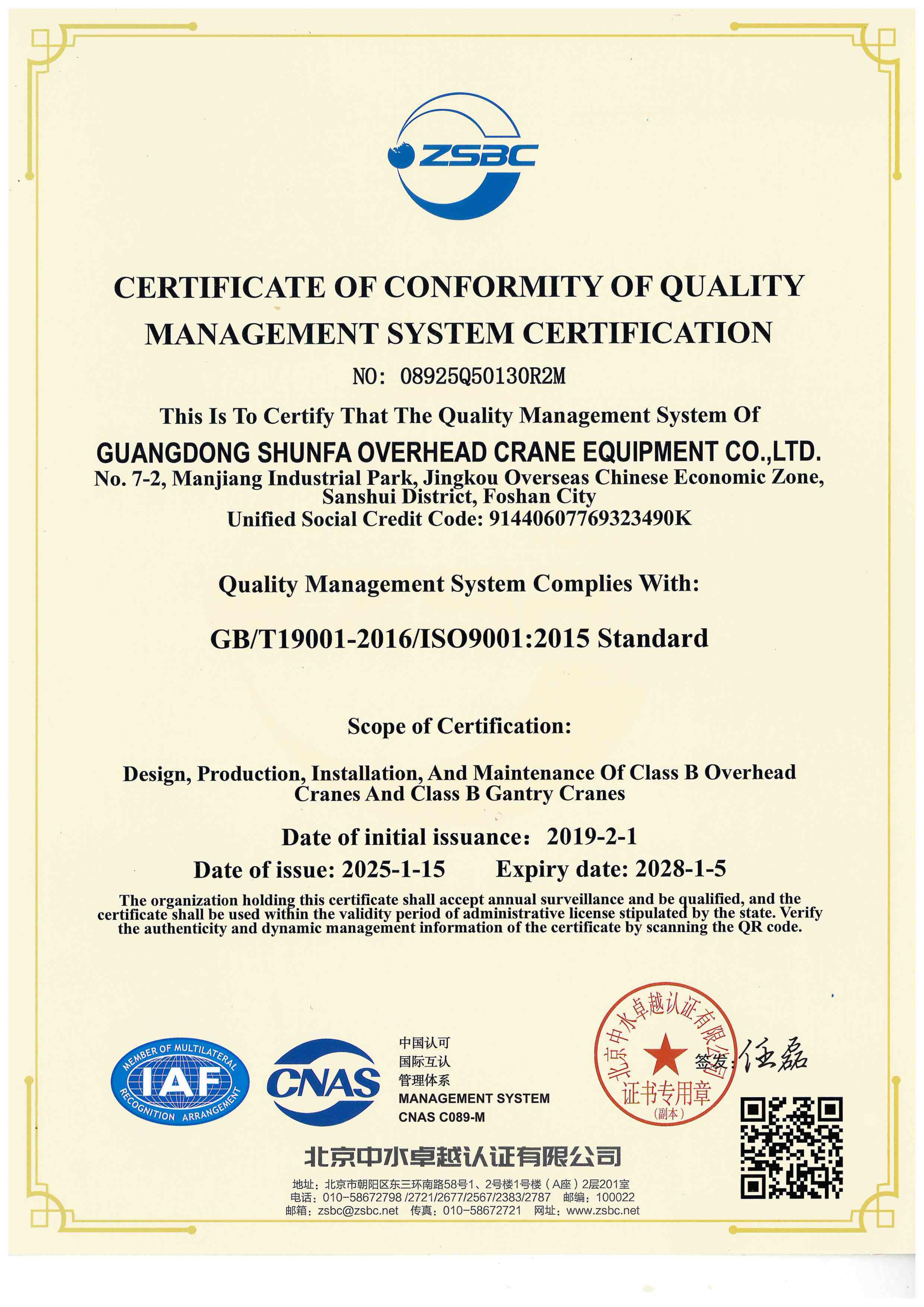 CERTIFICATE OF CONFORMITY OF QUALITY MANAGEMENT SYSTEM CERTIFICATION