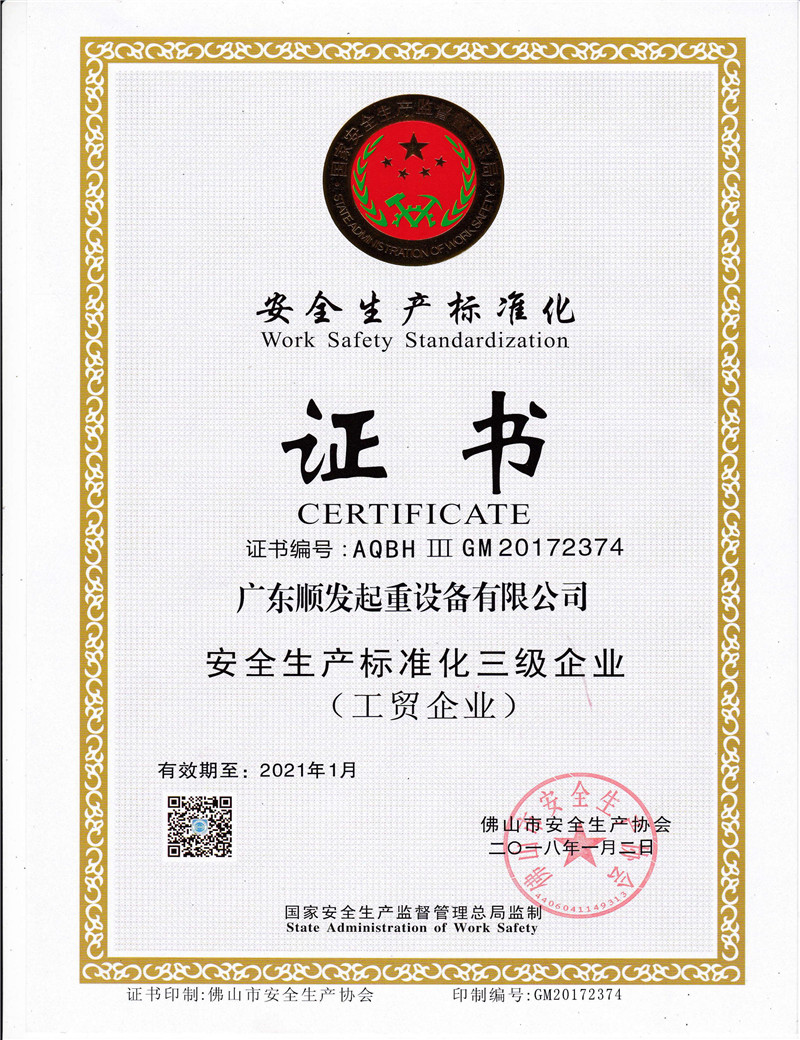 起重机安全生产标准化证书