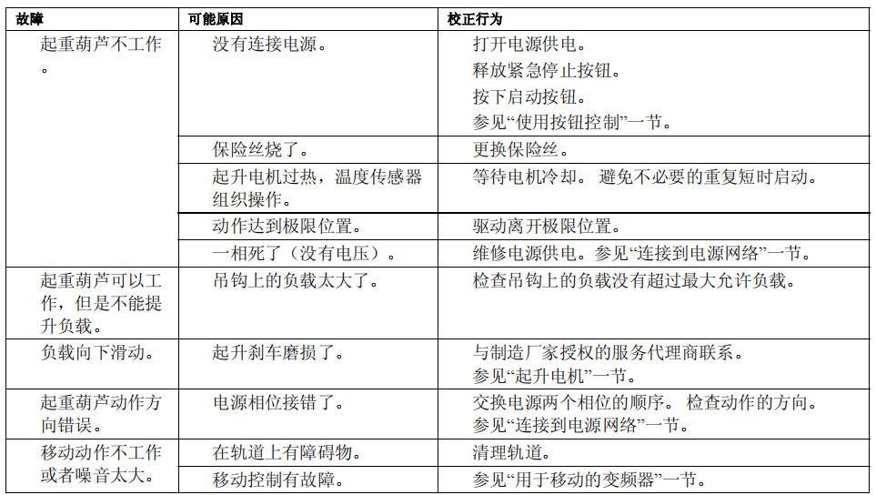 下面的表格中列出起重葫芦中可能会发生的一些故障和错误,它们的起因和消除它们所需要的校正行为。 如果使用这个表格不能识别并消除故障,就与我司授权的服务代理商联系。