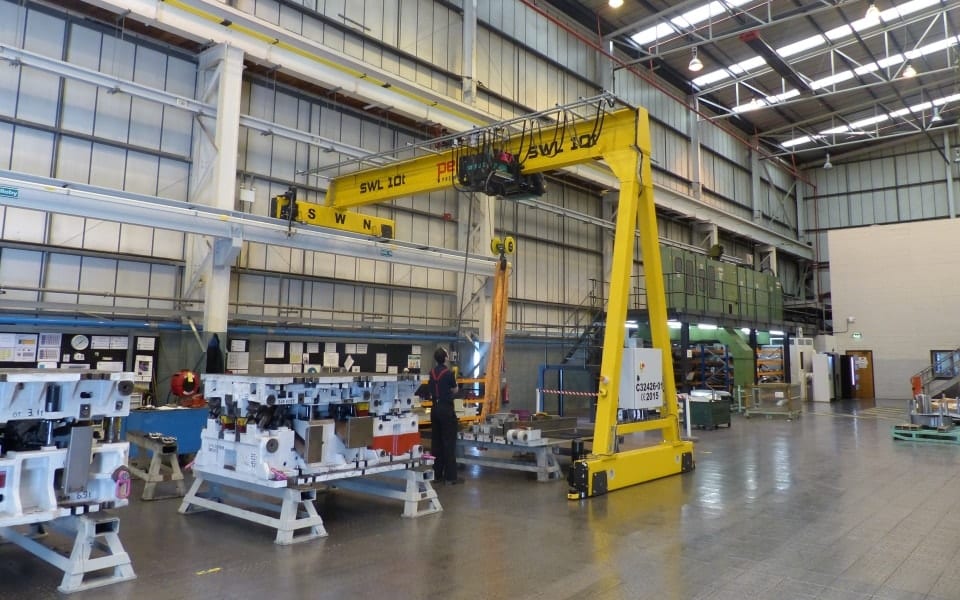 龙门起重机也可以设计成一条腿骑在轮子或轨道上,而起重机的另一侧骑在连接到建筑立柱或建筑结构侧壁的跑道系统上。这些是有利的,因为它们可以节省您的地面空间/工作空间。与桥式起重机不同,这种设置不需要两条跑道由建筑柱支撑或系在柱子上。这就是半门式起重机,可以有效节省空间。
